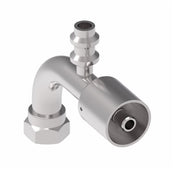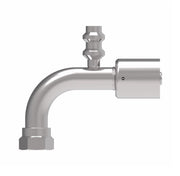 75712E-Z01 Weatherhead by Danfoss | 757 'E' Series | Female Bumped Tube O-Ring Swivel Tube 90° Elbow with R134a Low Service Port Crimp Fitting | -10 Female Bumped Tube O-Ring Swivel x -10 Hose Barb | Steel