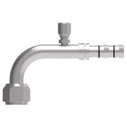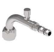 FJ3289-02-1010S E-Z Clip System by Danfoss | Female O-Ring 90° Elbow (Long Pilot) with Charge Port (7/16-20 thd) | A/C Refrigeration Fitting | -10 Female O-Ring Long Pilot x -10 Hose Barb | Steel